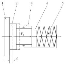 當油壓力 p=0 時,即 F1=0,閘瓦與制動盤之間的間隙 Δ=0,此時為全制動狀態。
